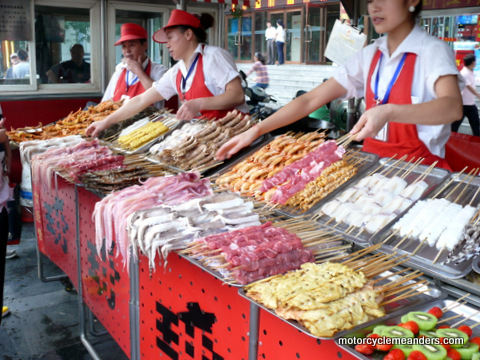 Then there were the occasions when we ate really out – like on the street. There was the quick and easy breakfast of a pancake omelette dished up by a lone, footpath vendor from his small wheel barrow. But there was also the permanent day and night food market on a particular street that we stumbled across on the way back from our ‘Imperial Beijing’ day. We later returned to it on our last night in Beijing. Its array of food waiting to be instantly cooked on purchase was as varied as it was enticing: seafood of all sorts, Peking Duck, skewered meats, vegetables, and an assortment of fruits and deserts. Then for the aficionados – although we noted this was as much a novelty to the Chinese as it was to us: a spread of such delicacies as scorpions, silk worms, snake and big black spiders!